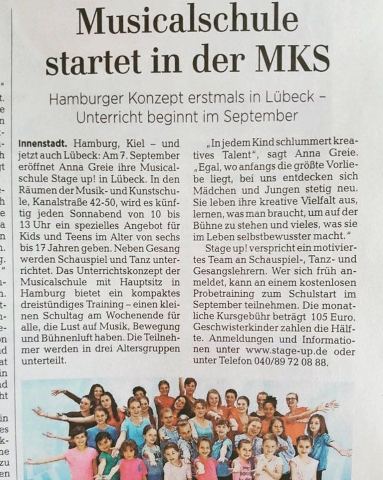 Am 7. September 2019 hat Stage UP! in Lübeck eröffnet. In den Räumen der Musik- und Kunstschule Lübeck in der Kanalstr. 42 - 50 gibt es damit jeden Samstag ein spezielles Angebot für Kids und Teens im Alter von 6 bis 17 Jahren geben. Neben Gesang werden Schauspiel und Tanz unterrichtet. Ein kleiner Schultag am Wochenende für alle, die Lust auf Musik, Bewegung und Bühnenluft haben. Du willst dabei sein und dich einfach mal ausprobieren?